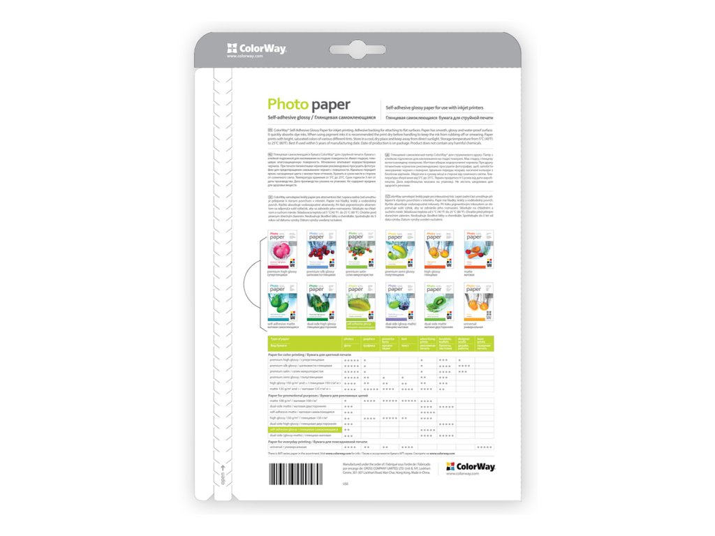Samolepiaci fotopapier s lesklým povrchom vhodný pre vysokokvalitnú atramentovú tlač. Špeciálna povrchová úprava zabezpečuje okamžité schnutie farbiva, odolnosť voči vode a vlhkosti, vysoký kontrast farieb. Lesklý fotopapier značky ColorWay zaručí výnimočne efektné lesklé výtlačky a farby. Lesklý papier okamžite absorbuje vodorozpustné atramenty. Pri tlači pigmentovými atramentmi sa odporúča výtlačok vysušiť, aby sa zabránilo jeho rozmazaniu. Je vhodný pre termickú a piezoelektrickú tlač. Odporúčame uchovávať vytlačené fotografie v albumoch alebo v rámoch pod sklom.